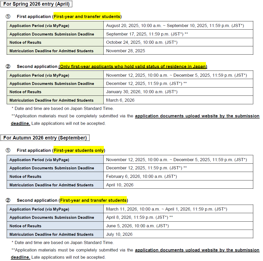 - For 2026 AY admissions and after, application documents must be submitted via the application documents upload website. Make sure you complete your application via the online application website (MyPage), pay the application fee, and obtain the Receipt Number before uploading the documents. For the details about the submission process, please see the Application Procedures Booklet of the program you are applying for.