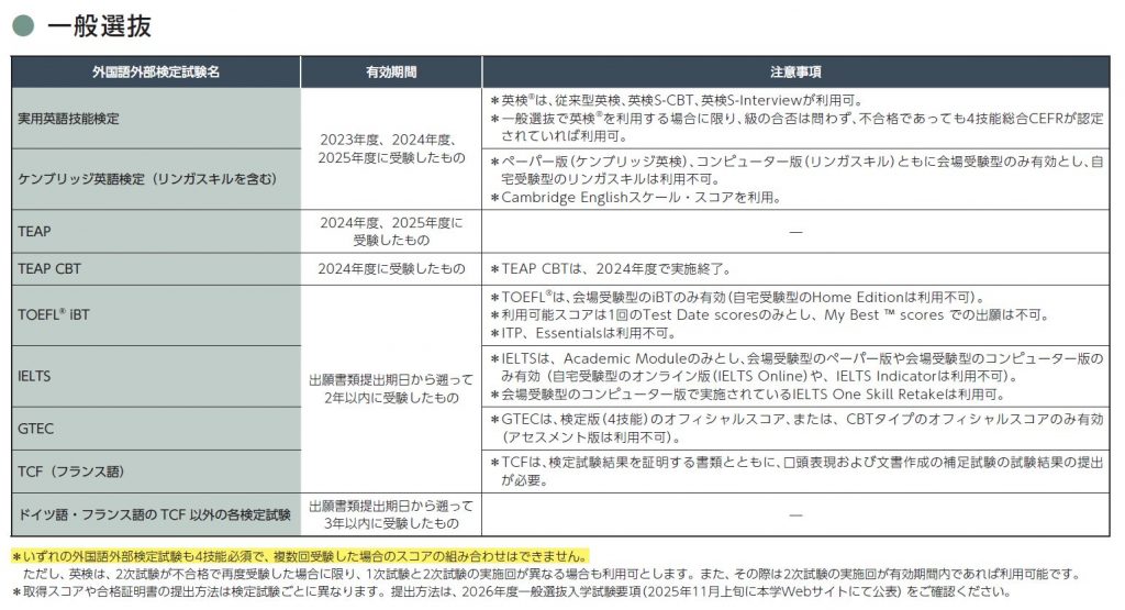 また、外部検定試験結果を提出した場合でも大学入学共通テストの外国語科目の受験は必須とします。いずれの外国語外部検定試験も4技能必須で、複数回受験した際の各技能スコアの組み合わせはできません。ただし、英検は、2次試験が不合格で再度受検した場合に限り、1次試験と2次試験の実施回が異なる場合も利用可とします。また、その際は2次試験の実施回が有効期間内であれば利用可能です。